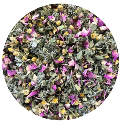 Frambozenblad: helpt bij het reguleren van hormonen en post partum kwalen. Heeft een ontstekingsremmende eigenschap en kan bijdragen aan het versterken van het immuunsysteem.