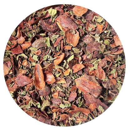 Pepermunt brengt een verfrissende, verhelderende energie naar de diepe tonen van cacao. Deze blend werkt als een frisse wind door hoofd en hart, en helpt bij mentale helderheid en innerlijke focus.